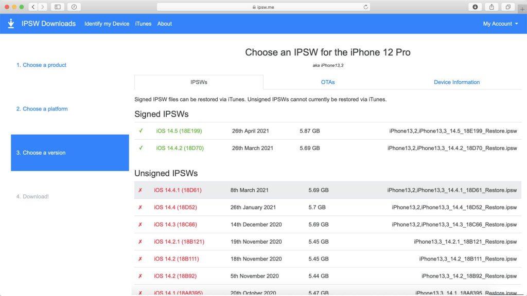 یکی از بهترین سایت‌هایی که برای دانلود ios این فایل می‌توان استفاده کرد، سایت ipsw.me بوده و ما در این آموزش استفاده از این سایت را آموزش می‌دهیم. توجه داشته باشید که این سایت تغییری در فایل ایجاد نکرده، فایل را روی سرور خود قرار نداده و فقط با طبقه‌بندی لینک‌های موجود در سایت اپل، دانلود را برای کاربران ساده‌تر می‌کند.