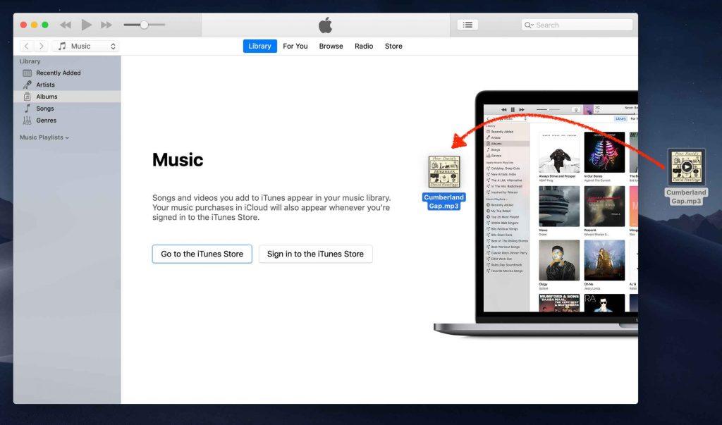۱. برنامه iTunes را باز کنید و موزیکهای خود را با روش کشیدن و رها کردن (Drag & Drop) به داخل آیتیونز بفرستید.